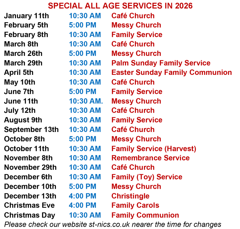 Communion 1st and 3rd Sundays Cafe Church or Family Service 2nd Sunday